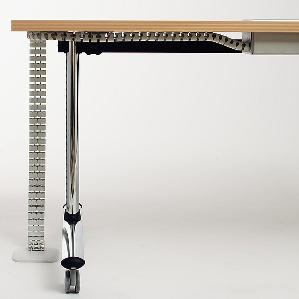 Una estructura de acero cromado, liviana y pura, se presenta como soporte para sistemas de salas de clase o capacitación. Mesas abatibles dotadas de ruedas con bloqueo, para utilizar en las más variadas ocasiones. Fácilmente apilables y reutilizables, unen a la flexibilidad todo el confort y la solidez de una mesa fija normal.