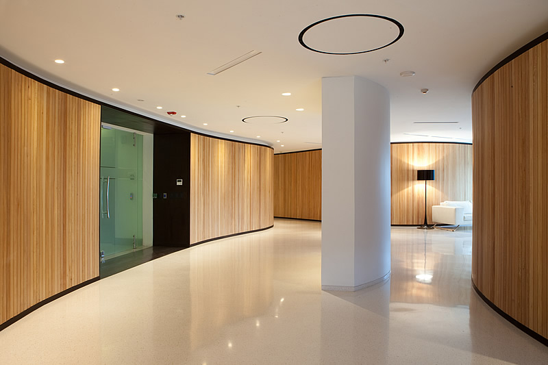 Oficina BoutiquePara esta oficina de inversiones, de 630 metros cuadrados, el arquitecto a cargo, Rodrigo Pedraza () quiso algo innovador, con un carácter puro y elegante. Tenía el difícil desafío de habilitar muros curvos, para lo que usó revestimiento de mañío que, dispuesto de manera vertical, seguía el movimiento natural de los muros. Esto, a la vez, le dio el pie para imprimirle a todo el proyecto un carácter orgánico, minimalista y de líneas simples: dejó piso y cielo blancos, con un sistema de iluminación Led que se proyecta en el suelo e ilumina de forma pareja; usó madera también para las puertas (mara clara teñida café moro); y le dio doble uso a los muros, con unos nichos que están contemplados para exhibir obras de arte hacia el pasillo, y muebles en el interior de la oficina.
