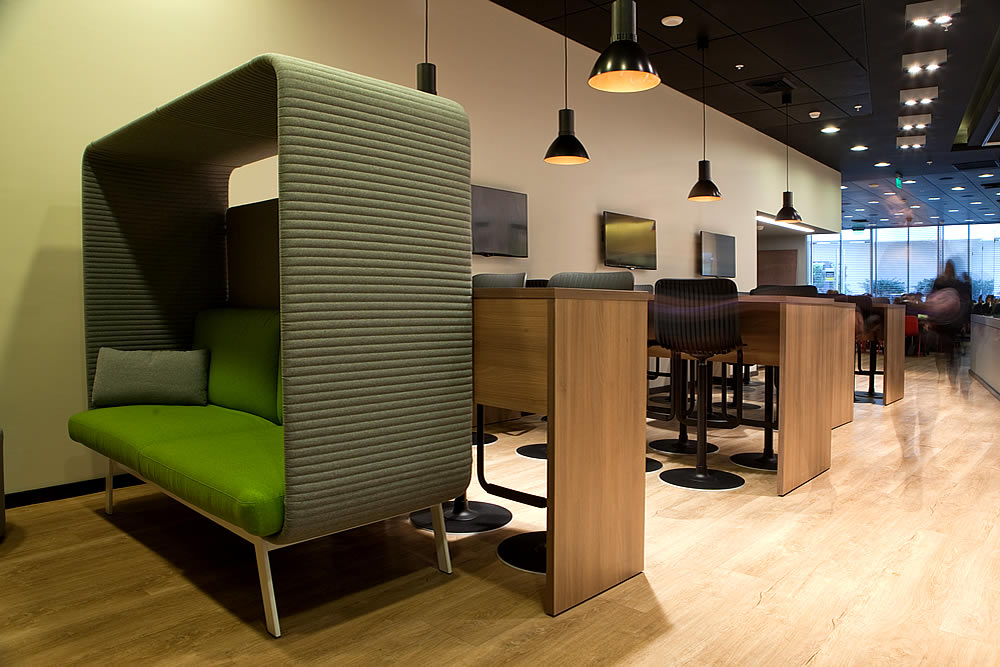 Los arquitectos Rodolfo Kaufhold y Hernán Molina tuvieron la misión de convertir la cafetería de esta empresa en un área que no sólo sirviera para almorzar, sino que además se usara para fomentar interacción.