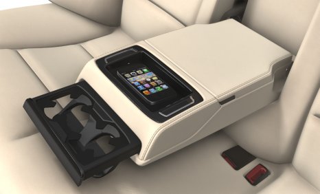 A cupholder, lighting elements, storage space, or ports for consumer electronics can be integrated into Johnson Controls’ modular rear seat armrest.