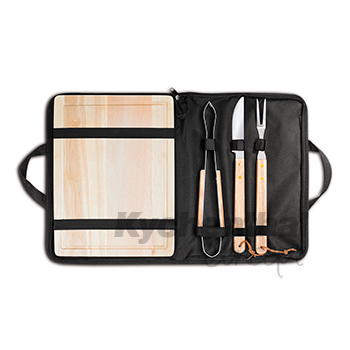 ASADO, SET CINCO PIEZAS, TABLA MADERA, CUCHILLO, TENAZA, PINCHO EN BOLSO CIERRE Y MANILLAS