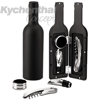 BOTELLA VINO, SET EN FORMA DE BOTELLA CON 3 INSTRUMENTOS DE ACERO INOXIDABLE EN CAJA